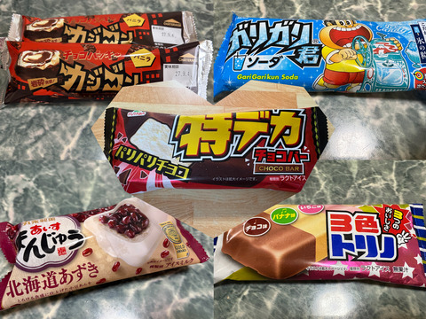 アイス5種の食べ比べ! まずは夏の定番『ガリガリ君』。私はソーダ党です。50円台で買えてこのうまさ! 最近よく買う『特デカ チョコバー』。これ···